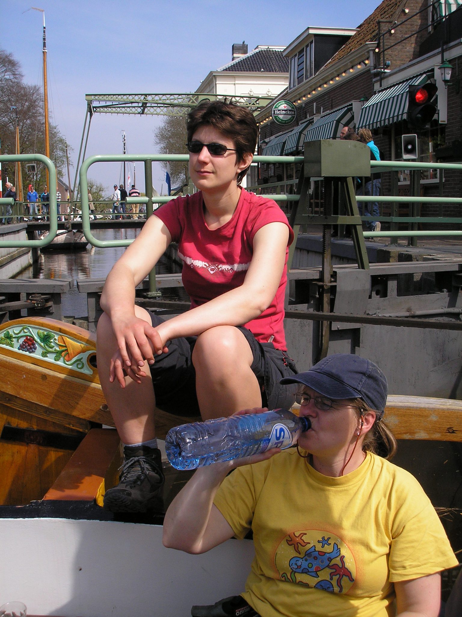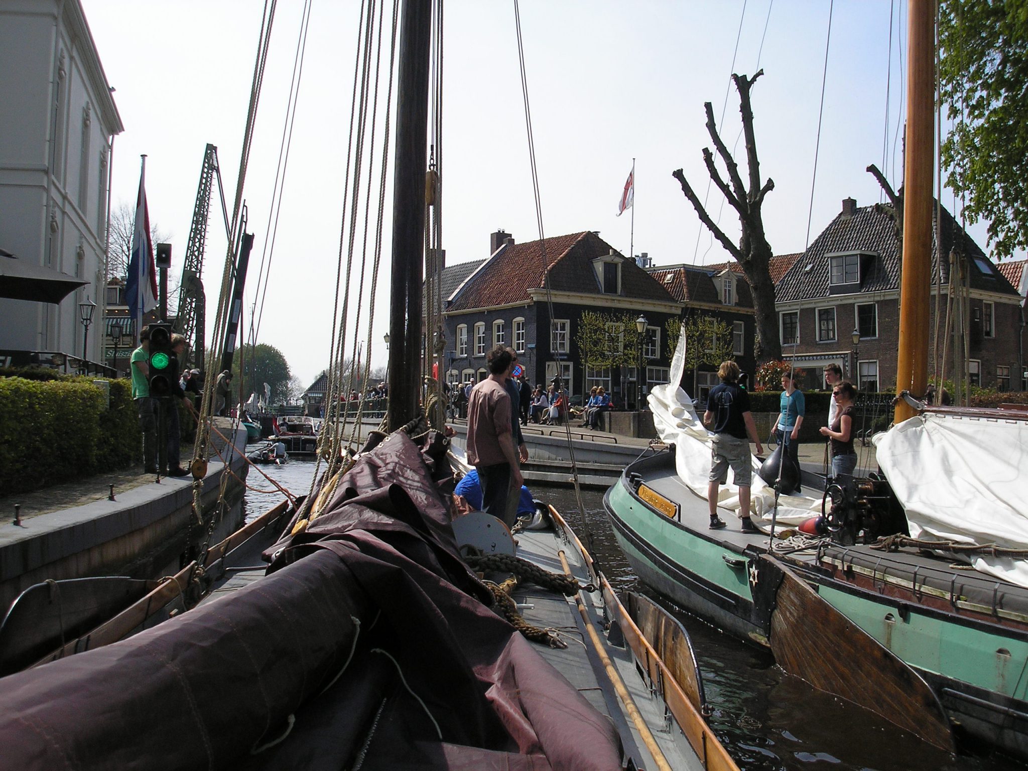 Van schipper Rob hebben we te horen gekregen dat we de avond van tevoren al terecht kunnen op het schip. Van die mogelijkheid willen we graag gebruik maken (acclimatiseren). Dus vrijdag rond 7 uur vertrekken we. Eerst Ardine ophalen, dan naar Maud en Stefanie en dan Ronny ophalen. Bestemming Workum alwaar de boot, een skutsje, ligt. Meteen zijn we Maud en Stefanie (auto) al kwijt. Later blijkt dat ze nog even terug naar huis zijn gereden om de wc (?) te controleren. Rond 21 uur komen we dan eindelijk (beetje verkeerd gereden) in Workum aan bij de boot. Er is al iemand, Rita. Ik denk dat ze van de organisatie is, maar dat blijkt niet zo te zijn. De boot is ‘gewoon’ toegankelijk, niet op slot. Wij gaan aan boord, maar oh oh wat is dat krap allemaal. Ik wist al wel dat de kajuit laag zou zijn, maar het is allemaal erg wennen en ik stoot een paar maal mijn hoofd aan de lage onderdoorgangen. AU!. Bovendien blijken de meeste bedden reeds bezet. Ik kruip helemaal naar de boeg. In het gangpad ligt allerlei zeilhout, lastig. Daar is nog een slaapruimte, zonodig nog krapper (minder hoog). Daar ga ik niet bivakkeren is mijn eerste reaktie. Maar er blijkt een luik naar het dek te zijn en dat maakt het verschil. Ik heb trouwens geen andere keus dus vooruit maar. Bedje opmaken, voor tassen en koffer een plekje vinden. En dan voeg ik me bij de anderen die in het keukentje zitten. Ronny is niet helemaal tevreden met haar plek. Ze had daarover afspraken gemaakt met Rob, maar die zijn blijkbaar niet ingelost. Met haar voer ik (als vanouds) diskussies. Lekker uitdiepen dus, maar soms heel vermoeiend. We besluiten met z'n allen naar het centrum van Workum te gaan, even een kroegje pikken. Daar blijkt het al 23.30 te zijn. Het eerste kroegje is dicht, maar er is er nog een. Heerlijk even ontspannen met een glaasje en kennismaken met degenen die we nog niet kennen, Frans en Rita.