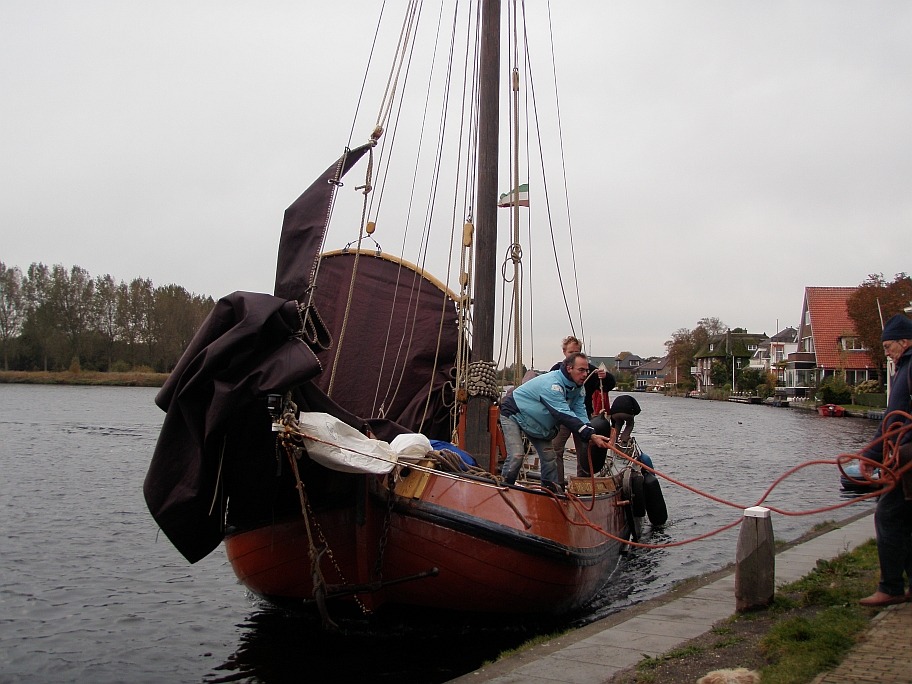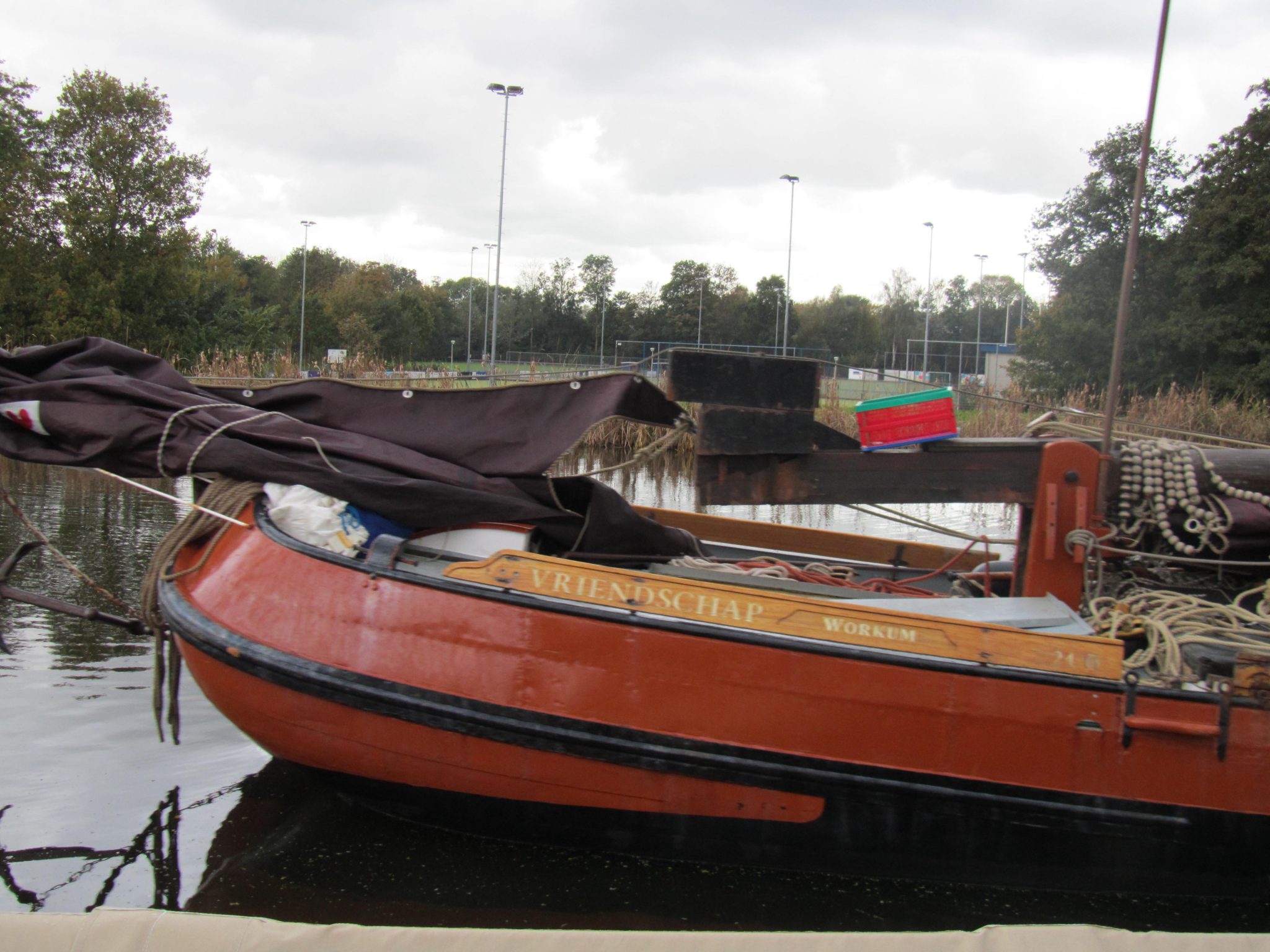 Na twee weken en drie weekenden intensief krabben, schuren, schilderen en plakken (met veel dank aan de klussers) lag Vriendschap aan de kade van de werf Nieko in Franeker te wachten. Strak in de verf, met een fris lente groen interieur. Frank was een paar minuten na eerste kennismaking met het schip het vlak aan het oliën onder de planken vloer. Inruimen werd zo nu en dan gehinderd door een plensbuitje. De regentijd werd handig benut voor de laatste aankopen. Vervolgens werd met aanwijzingen van Rob en Coby het schip opgetuigd. Of ik even een ".. " wil aangeven. Best lastig als je niet weet hoe een ".. "er uit ziet. Een blok met hondsvot of puntkous, iemand???